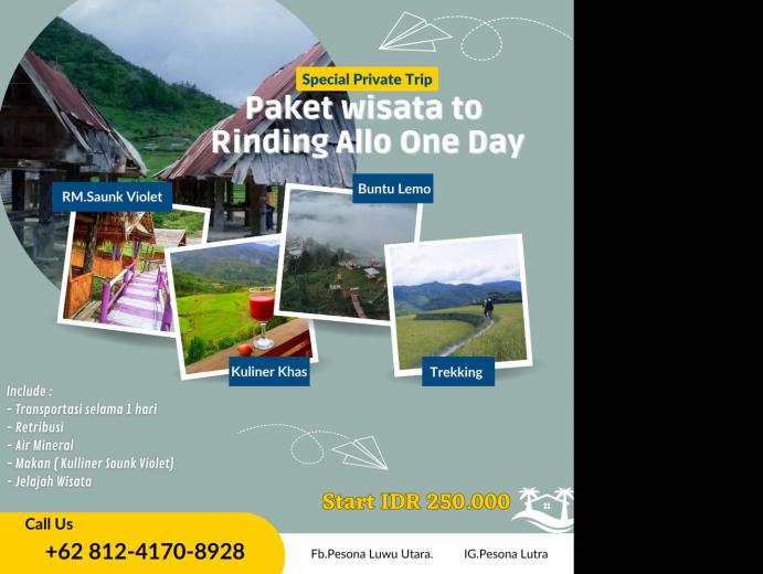 Deskripsi Desa  : Desa Rinding Allo merupakan Desa yang berada di pegunungan Luwu Utara. terletak di ketinggian ± 1600 mdpl, memiliki panorama indah mempesona dibalut udara sejuk dengan suhu 17-20 derajat celcius  di siang hari dan dapat turun hingga 16 derajat celcius pada malam hari dengan budaya yang masih terjaga. Secara umum masyarakat Desa Rinding Allo bermata pencaharian petani sawah dan perkebunan serta sebahagian masih menggeluti budaya menenun. Perkampungan Rinding Allo dikelilingi sawah terasering dan perkebunan hortikultura serta sebahagian rumah-rumah warga dijadikan rumah tenun untuk memproduksi kain tradisional Tenun Rongkong yang merupakan salah satu identitas kejayaan peradaban kerajaan Luwu dimasa lampau.  sudah menjadi hal yang lumrah  jika  para wisatawan yang berkunjung ke desa Rinding Allo akan merasakan  pengalaman hidup dalam suasana pedesaan yang asri. Dimana para wisatawan akan menginap di homestay bersama warga dan akan menikmati kebiasaan hidup warga desa, mulai dari kebiasaan memasak di dapur tungku menggunakan kayu bakar, dan pengunjung juga dapat belajar seni budaya seperti proses pembuatan tenun rongkong di tengah hamparan sawah terasering, tarian tradisional hingga turun sawah untuk tangkap ikan maupun tanam atau panen padi. Desa Wisata Rinding Allo yang berada di wilayah Kec. Rongkong Kab. Luwu Utara, teleh lolos masuk 300 besar Anugerah Desa Wisata Indonesia pada Tahun 2021 dan juga lolos masuk 15 besar lomba promosi desa wisata pada Tahun 2022 yang dilaksanakan Kementerian Desa. Selain itu Desa Wisata Rinding Allo juga pernah menjadi lokasi pengambilan video Film Selimut Kabut Rongkong untuk mengangkat potensi desa lewat film yang tayang di bioskop-bioskop nasional pada tahun 2022. Salah satu objek wisata unggulan yang berada di Desa Wisata Rinding Allo adalah Kampung  Budaya Tenun Rongkong Salurante yang dikelola oleh Kelompok Sadar Wisata Rante Kasimpo. Dan Pada Tahun 2019 Pokdarwis Rante Kasimpo menjadi juara 1 dalam kompetisi Pokdarwis tingkat Provinsi Sulawesi Selatan yang kemudian mewakili Provinsi Sulawsi Selatan ke tingkat Nasional. Memiliki beragam daya tarik wisata yang alami diantaranya kesejukan air terjun rante kasimpo, Daya Tarik Wisata Buntu Lemo yang menawarkan Wisata Agro dengan belajar bercocok tanam mulai dari cara tanam hingga panen. Dapat pula berbelanja hasil bumi segar sebagai ole-ole serta dapat melakukan atraksi sepeda gunung menjelajah pegunungan dari kampung ke kampung. Rinding Allo juga memiliki Daya Tarik Wisata Puncak Tabuan yang berada di Puncak Desa Rinding Allo dan dapat dicapai dengan hiking 30 menit. Puncak Tabuan memiliki panorama indah yang menakjubkan untuk para pejuang anurika dan pecinta senja karena di tempat ini pengunjung dapat menikmati sunrise dan sunset pegunungan, selain itu pengunjung juga akan disuguhi pemandangan perkampungan tradisional yakni deretan rumah-rumah panggung dibalut kesejukan . Dan memiliki warisan nusantara yang telah ada sejak ratusan tahun silam yakni Tenun Rongkong yang diproduksi secara turun temurun oleh para pengrajin tenun di kampung tenun Rongkong Salurante, di kampung ini terdapat Galery Tenun Rongkong untuk berbelanja cinderamata hasil kerajinan para pengrajin tenun rongkong. Pengunjung juga dapat belajar proses pembuatan tenun rongkong yang dilakukan secara tradisional, bahkan pengunjung juga dapat turut serta dalam pengambilan bahan pewarna alami dari akar dan daun kayu tertentu di hutan adat Rinding Allo. Desa Rinding Allo sendiri merupakan daerah perlintasan menuju Kecamatan Seko yang rencananya wilayah Kec. Seko akan menjadi segitiga emas yang akan menghubungkan 3 Provinsi yakni Provinsi Sulawesi Selatan, Provinsi Sulawesi Tengah dan Provinsi Sulawesi Barat.